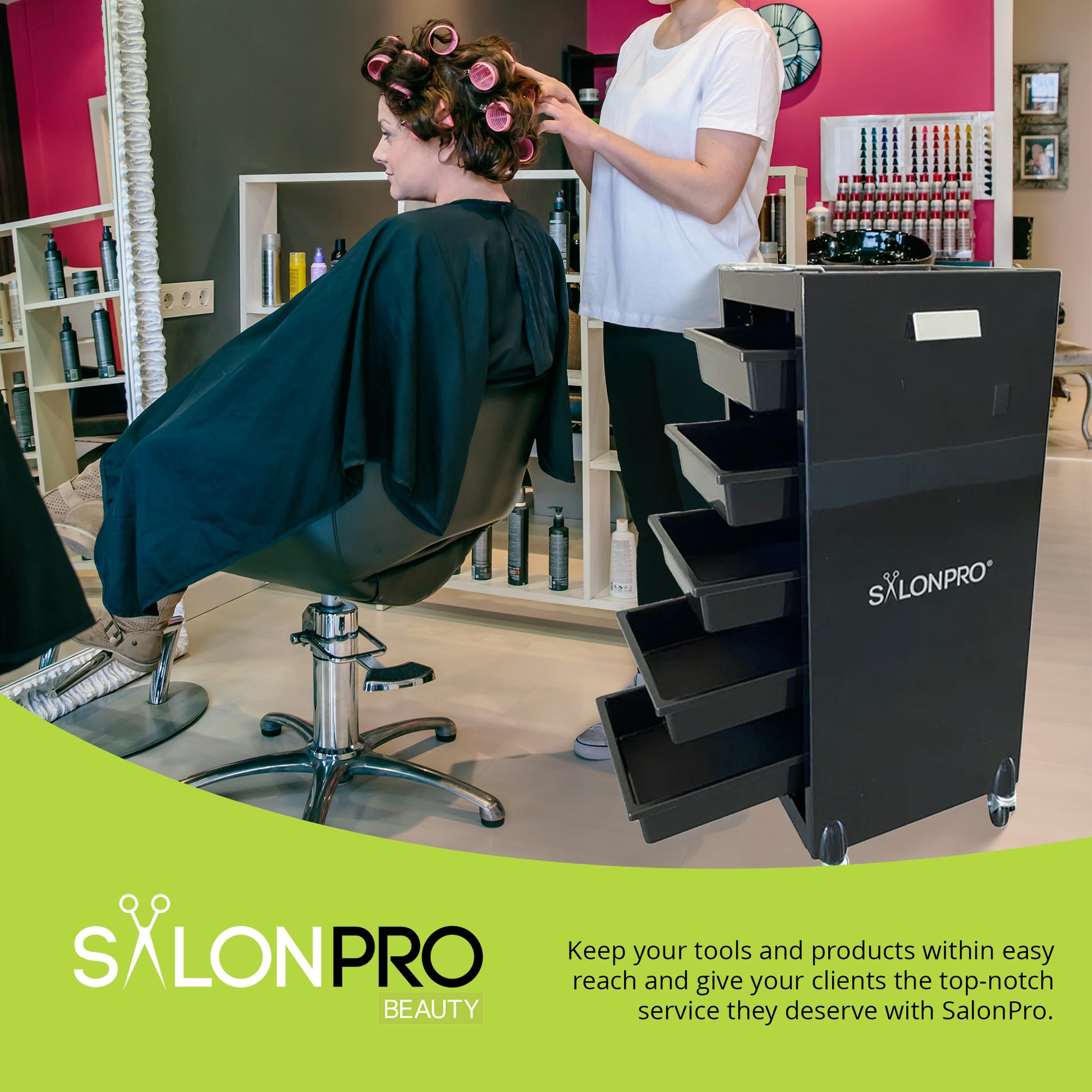 SalonPro Gabinete de peinado con 5 cajones, carrito para colorear y almacenar con ruedas en negro brillante